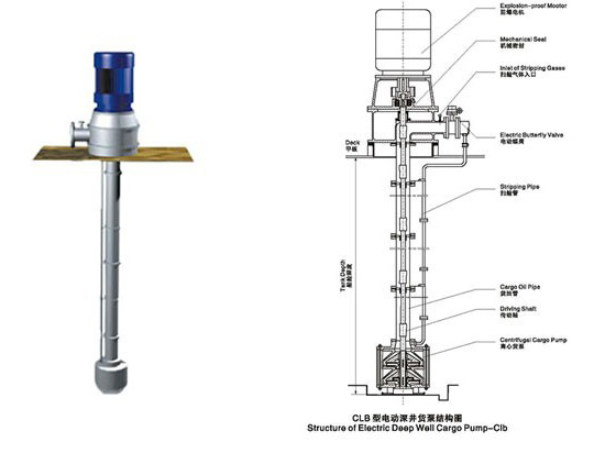 CLB型电动深井货泵由双级离心泵、连接管及电机座,电机四大部件组成,电机座、电机安装在甲板上,离心泵及连接管安装在货舱内,浸没在货物中,传动轴支承在滚动轴承及特种塑料导轴承中,并通过弹性联轴器与电机相联接;传动轴的密 封采用机械密封结构,能适应各种化工介质的输送要求。
